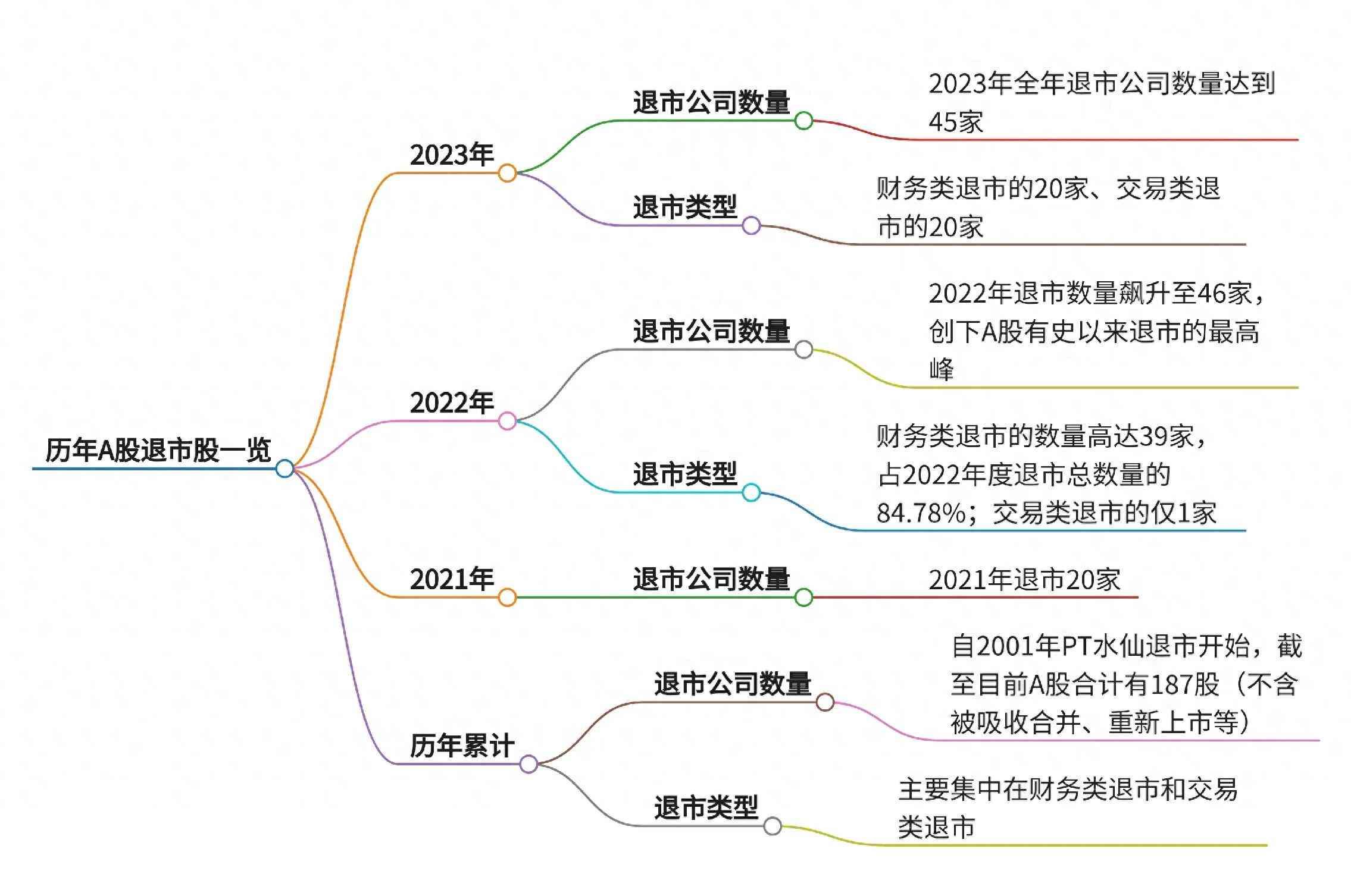 根据相关数据统计,1999年至今,共退市企业234家。其中1999年退市1家(0508.SZ琼民源A);21年退市3家(6625.SH PT水仙、0588SZ PT粤金曼、015.SZ PT南洋);22年退市7家;23年退市4家。2013年退市6家,2014年退市1家,2015年退市7家,2016年退市1家,2017年退市4家,2018年退市5家,2019年退市10家,2020年退市16家,2021年退市20家,2022年退市46家,创下了当时的退市数量高峰,2023年全年有45家公司退市,2024年截至目前已经有49家公司退市,A股市场的新陈代谢呈现加速趋势。
