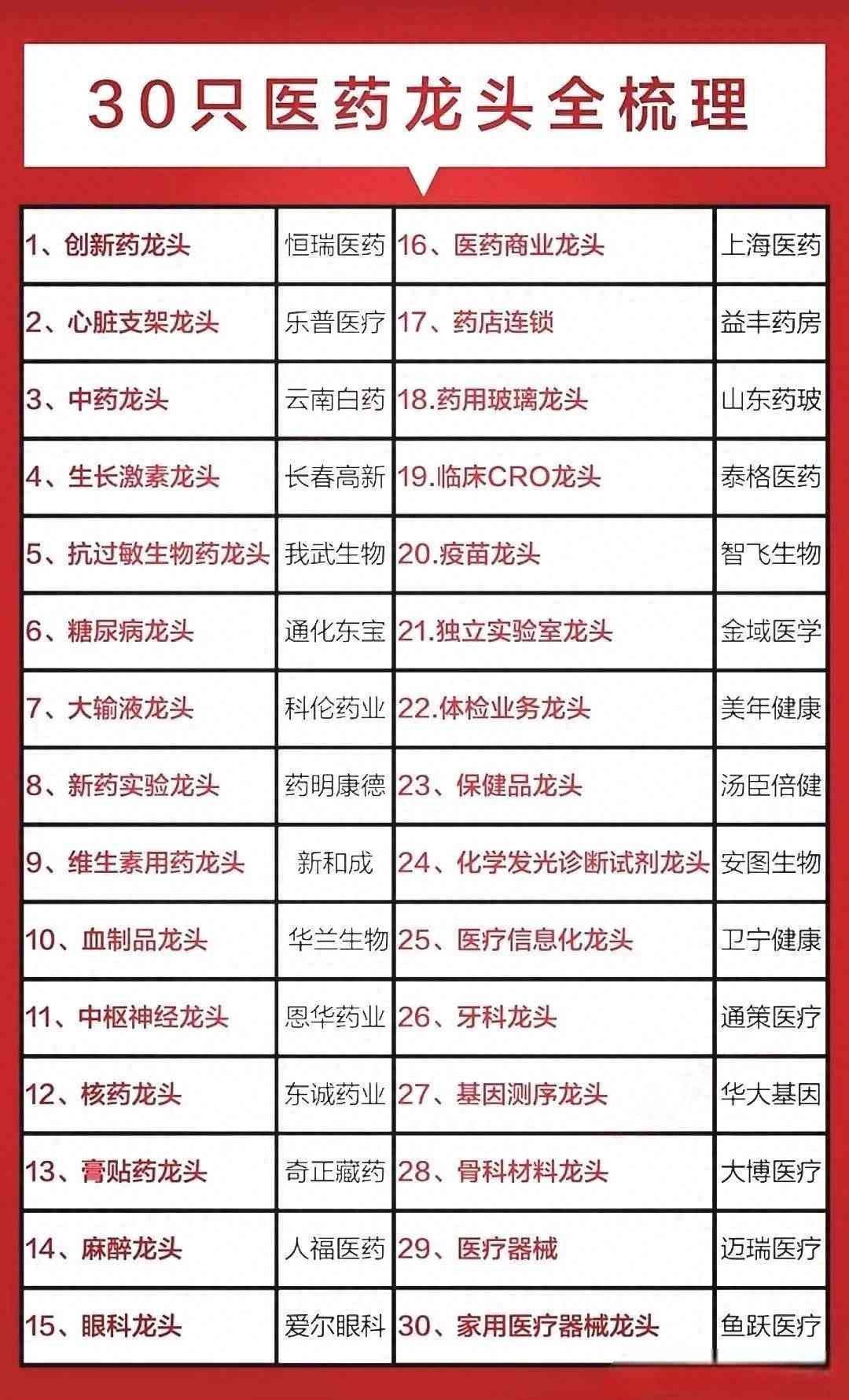 30只医药龙头全梳理