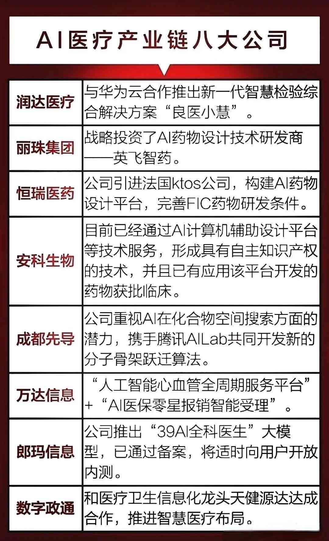 润达医疗与华为云合作推智慧检验方案;丽珠集团投资AI药物设计商;恒瑞医药构建AI药物设计平台;安科生物有自主AI技术及获批药物;成都先导等公司也在AI医疗领域各有布局与合作。