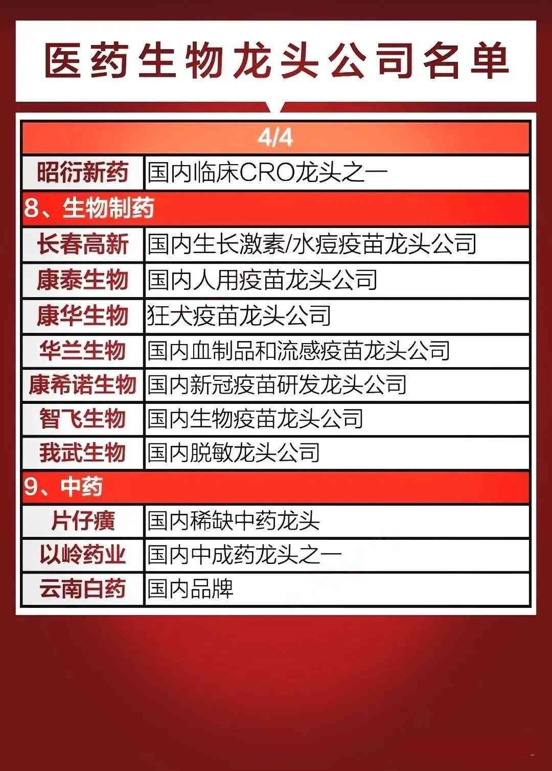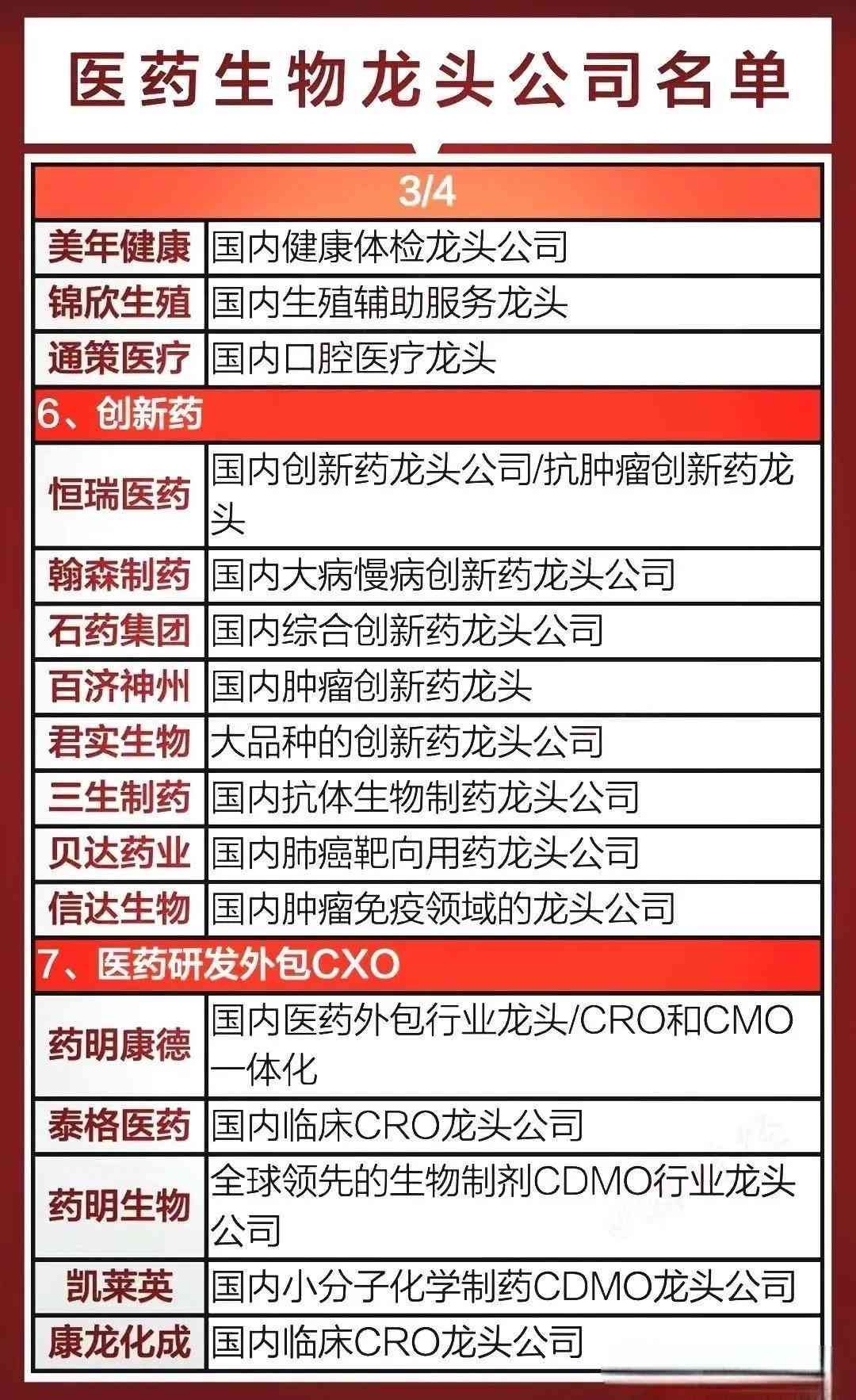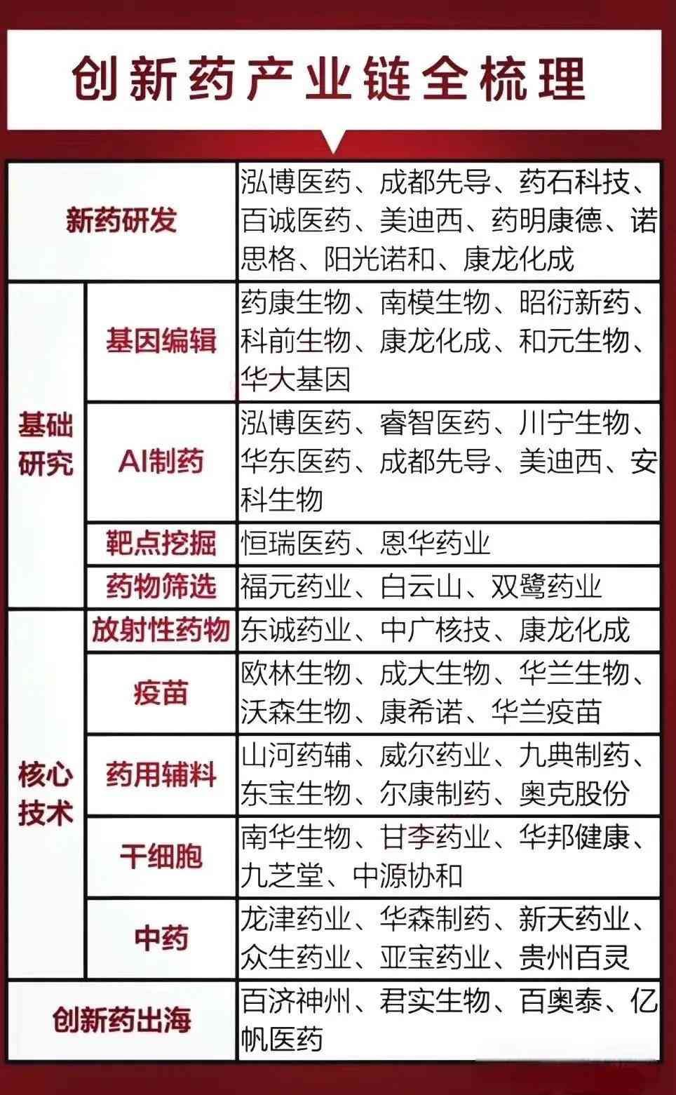 涵盖新药研发(如药明康德等)、基础研究(包括基因编辑、AI制药等)、核心技术(如疫苗、药用辅料等)及创新药出海(如百济神州等)各环节的相关企业。