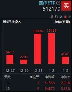 值得关注的是,前一周(2024年12月30日-2025年1月3日),医疗ETF(512170)连续5日申赎净流入,金额合计超5.2亿元。时间拉长来看,医疗ETF(512170)此前10日累计吸金超8.4亿元。