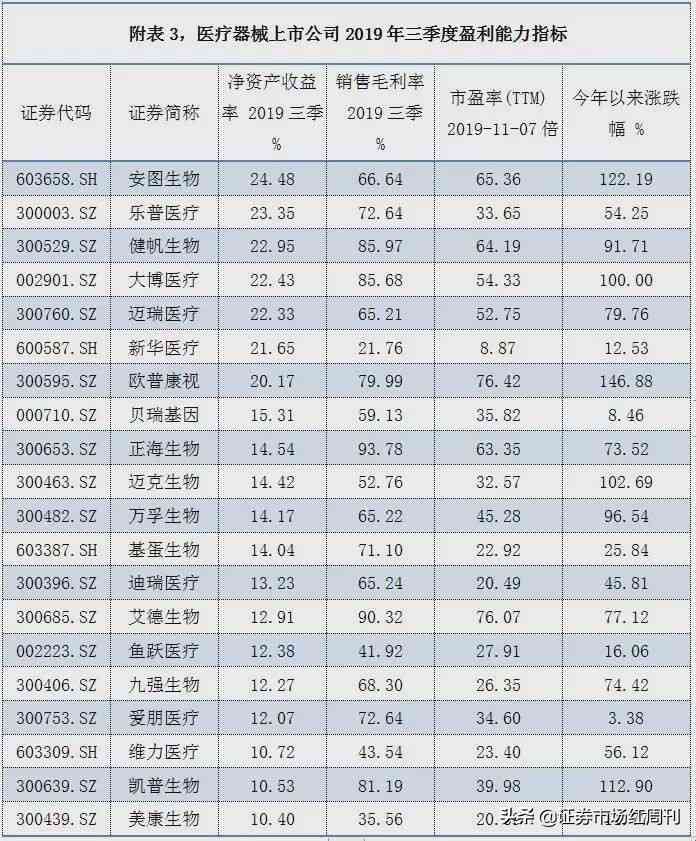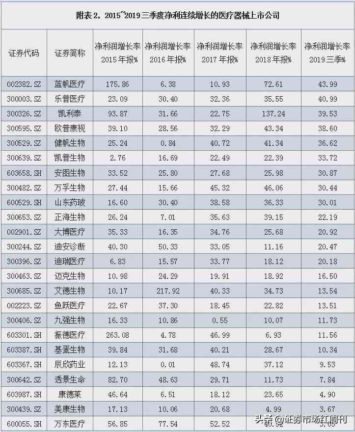 成长角度来看,据刚刚落幕的2019年三季报梳理显示,58家医疗器械个股当中,三季报实现净利增长的有42家,业绩增长个股占比同样超过7成。其中包括乐普医疗、欧普康视、健帆生物、安图生物、万孚生物、山东药玻等在内的20家医疗器械上市公司净利增幅均在30%以上。另外,在今年三季报实现净利增长的基础上,前四年(2015~2018)均连续实现了净利增长的医疗器械上市公司有24家。(见附表2)
