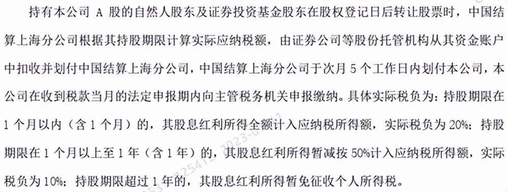 如上图所示,根据公告内容,计税问题,这与持股时间有关系,分红到账不扣税,卖出才扣税。如果你持有时间超过1年及以上就免税;如果持有时间一个月以上到1年,扣税10%;如果持有时间小于1个月,扣税20%。这里持有的时间指买入股票时间,如果分不同时段买入,在卖出时,是按照买入时间先后顺序来计算的,即所谓的先进先出规则。提醒新手朋友注意即可。