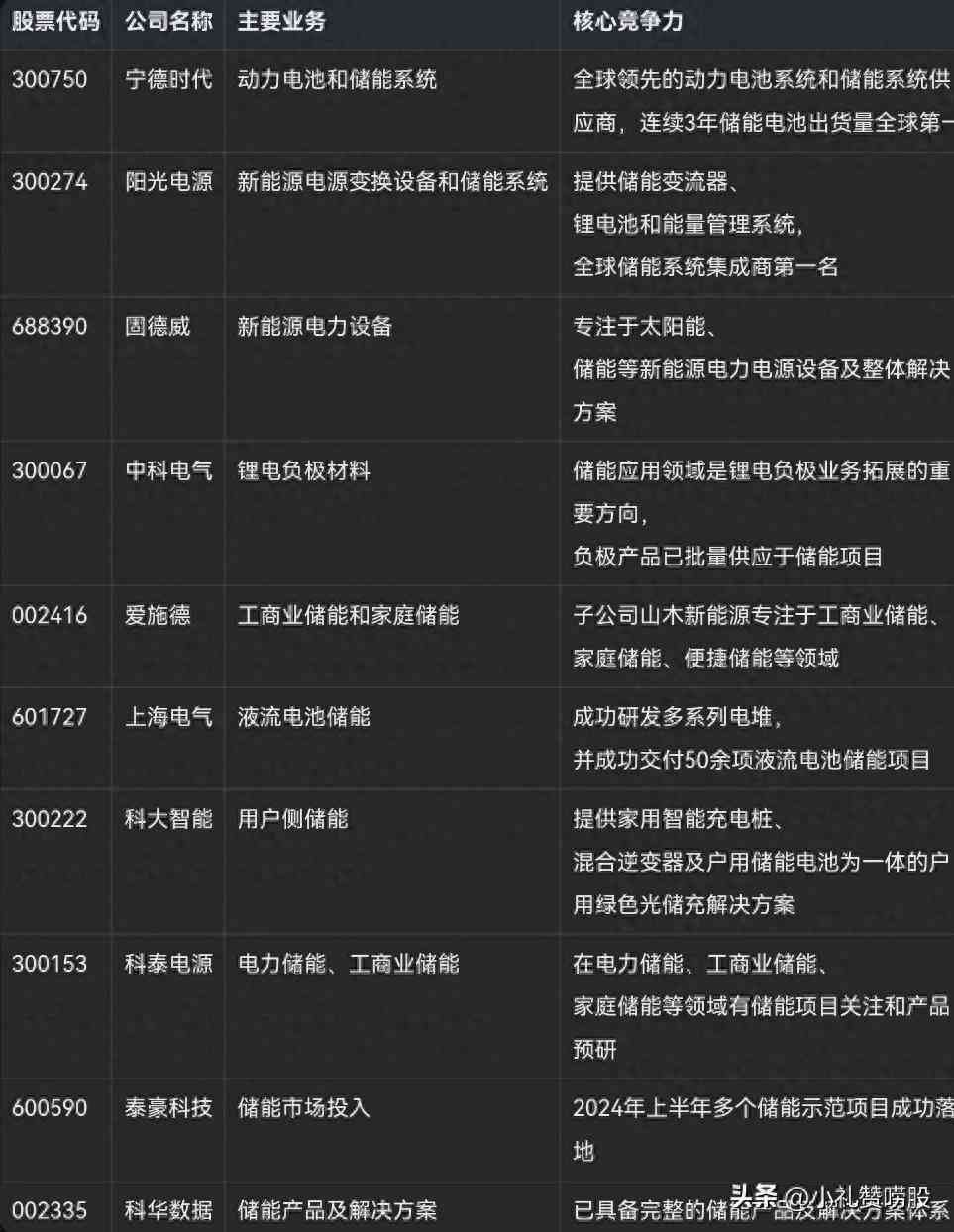 新型储能概念核心龙头股表格: