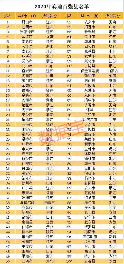 7月28日,赛迪顾问县域经济研究中心编制的《2020中国县域经济百强研究》(下称报告)正式发布。据悉,赛迪顾问直属于工业和信息化部中国电子信息产业发展研究院,是中国首家上市的咨询企业。榜单数据显示,百强县前十位依次是:昆山市、江阴市、张家港市、晋江市、常熟市、长沙县、太仓市、慈溪市、义乌市、龙口市。前三甲席位未发生变化,晋江市和常熟市发生易位,太仓市排名上升2位,慈溪市下降1位,而义乌市则新晋百强县前十位。