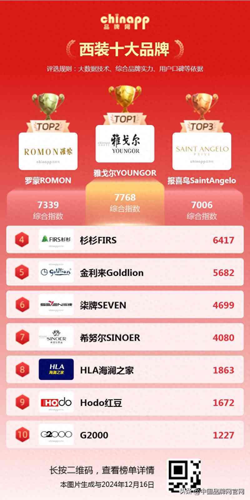 以上就是西 装十大品牌排行榜,想要了解更多行业榜单的,联系我们品牌网。品牌网-十大品牌排行榜-品牌大数据服务平台