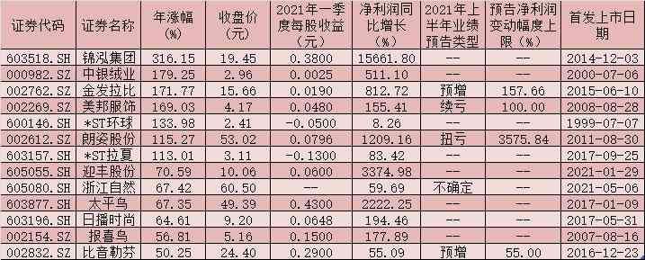 今年以来,纺织服装板块表现亮眼,其整体上涨18.99%,远远跑赢同期上证指数(年内累计下跌1.36%),位居申万一级行业涨幅榜前列。具体到个股方面,锦泓集团、中银绒业、金发拉比、美邦服饰、*ST环球、朗姿股份、*ST拉夏等7只个股年内股价实现翻番,迎丰股份、浙江自然、太平鸟、日播时尚、报喜鸟、比音勒芬等个股年内累计涨幅也均逾50%。