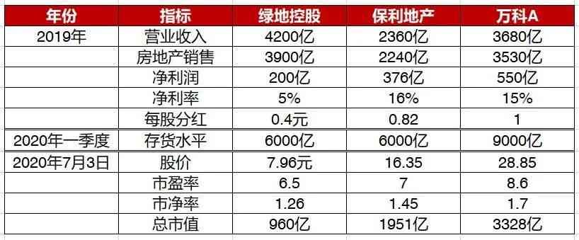 这样一对比就非常清晰了,绿地注重销量,2018/19年度两年欲冲击4亿的房产销售额均告失败,结果就是利润率非常低。而保利地产虽然销售额不及绿地,但净利润却超过绿地,在同样是6亿存货水平下,市场给到保利的估值水平高于绿地。万科就基本全方位的处于更优水平,因此市场给到的估值也明显更高。