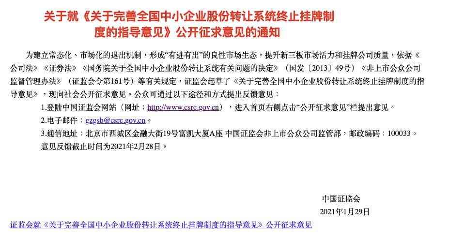 1月29日,证监会、全国股转公司分别发布《关于完善全国中小企业股份转让系统终止挂牌制度的指导意见》(下称《指导意见》)、《全国中小企业股份转让系统挂牌公司股票终止挂牌实施细则》(下称《实施细则》),并向社会公开征求意见。