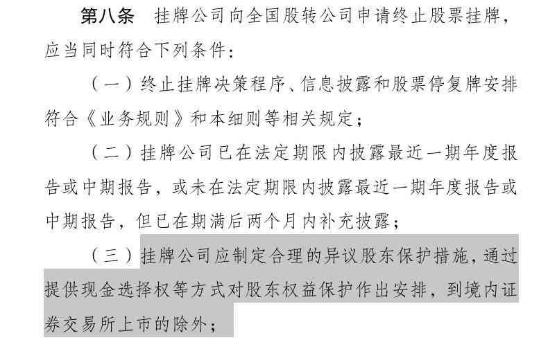 值得关注的是,股转公司提到,将投资者保护作为终止挂牌工作的重中之重,并作出“对于异议股东保护措施不合理且拒不改正等不符合主动终止挂牌条件的公司,股转将驳回其主动终止挂牌申请”等相关规定。
