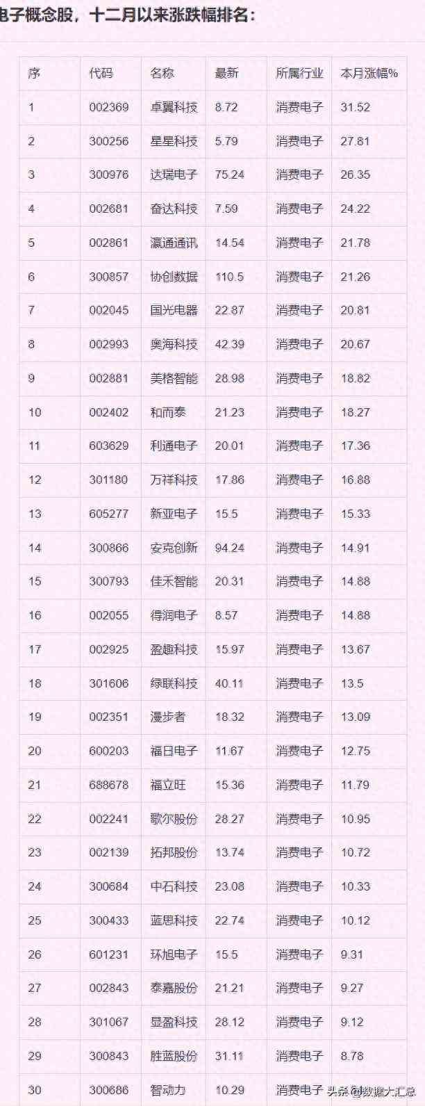 消费电子龙头股一览表,消费电子概念股,十二月以来涨跌幅排名: