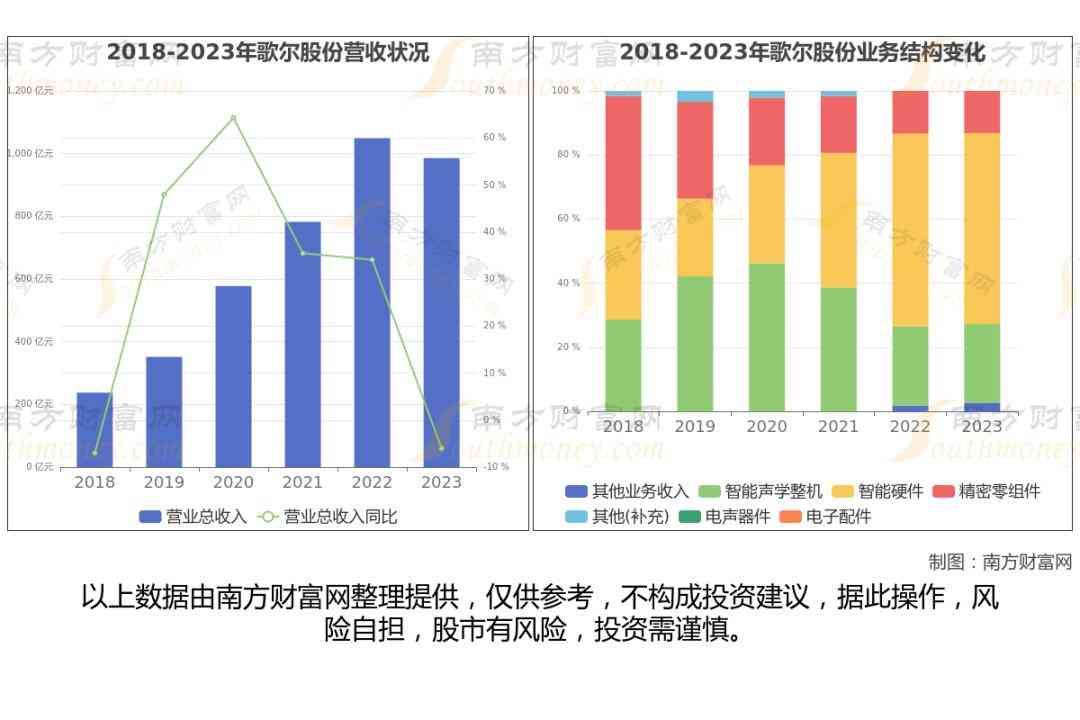 歌尔股份于28年5月22日在深圳证券交易所上市,公司主营业务为精密零组件业务、智能声学整机业务和智能硬件业务。