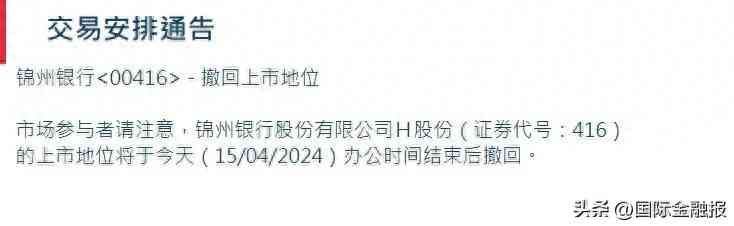 4月15日晚间,锦州银行发布一则交易安排通告称,市场参与者请注意,锦州银行股份有限公司H股份(证券代号:416)的上市地位将于当日办公时间结束后撤回。