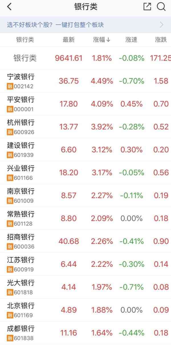 10月19日早盘,银行板块再度集体拉升。早盘银行股中,宁波银行(002142.SZ)、平安银行(01.SZ)一度涨逾5%,随后有所回落。截至发稿,宁波银行以2.33%领涨,38家银行股中只有8家小幅下跌。