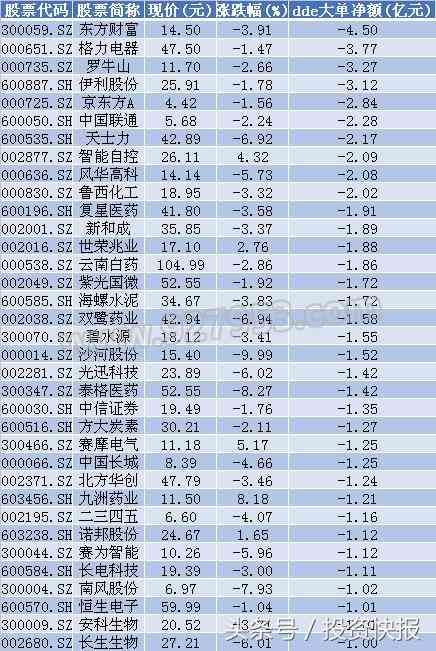 具体来看,主力资金出逃最多的是东方财富,大单净流出高达4.50亿。另外,格力电器、罗牛山和伊利股份等3只个股也遭到超3亿元的资金撤离。