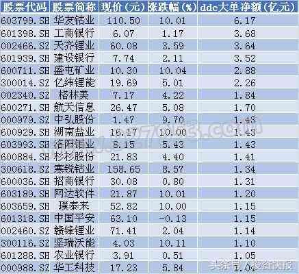 今日超过114亿元主力资金入场抄底,有212只个股获得超千万元低吸。其中,最受主力资金追捧的是锂电池龙头股华友钴业,以6.17亿的大单净流入独霸榜首。另外工商银行、天齐锂业和建设银行等3只个股也获得超3亿元的资金抢筹。