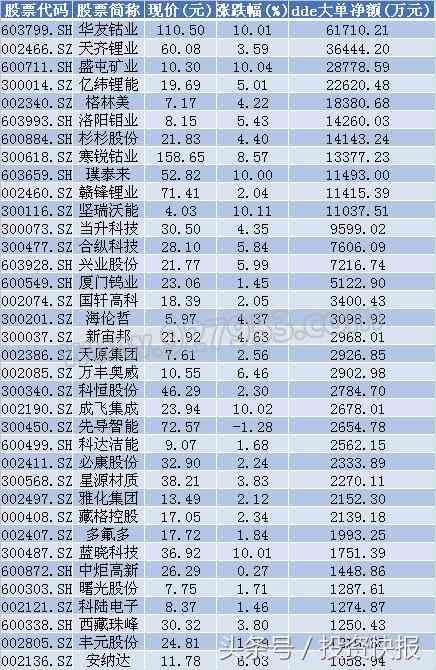 在今日主力资金追捧的前二十只个股中,锂电池概念股占据了11个席位。其中,华友钴业、天齐锂业、亿纬锂能、寒锐钴业、赣锋锂业等龙头股均获得超亿元的资金追捧。