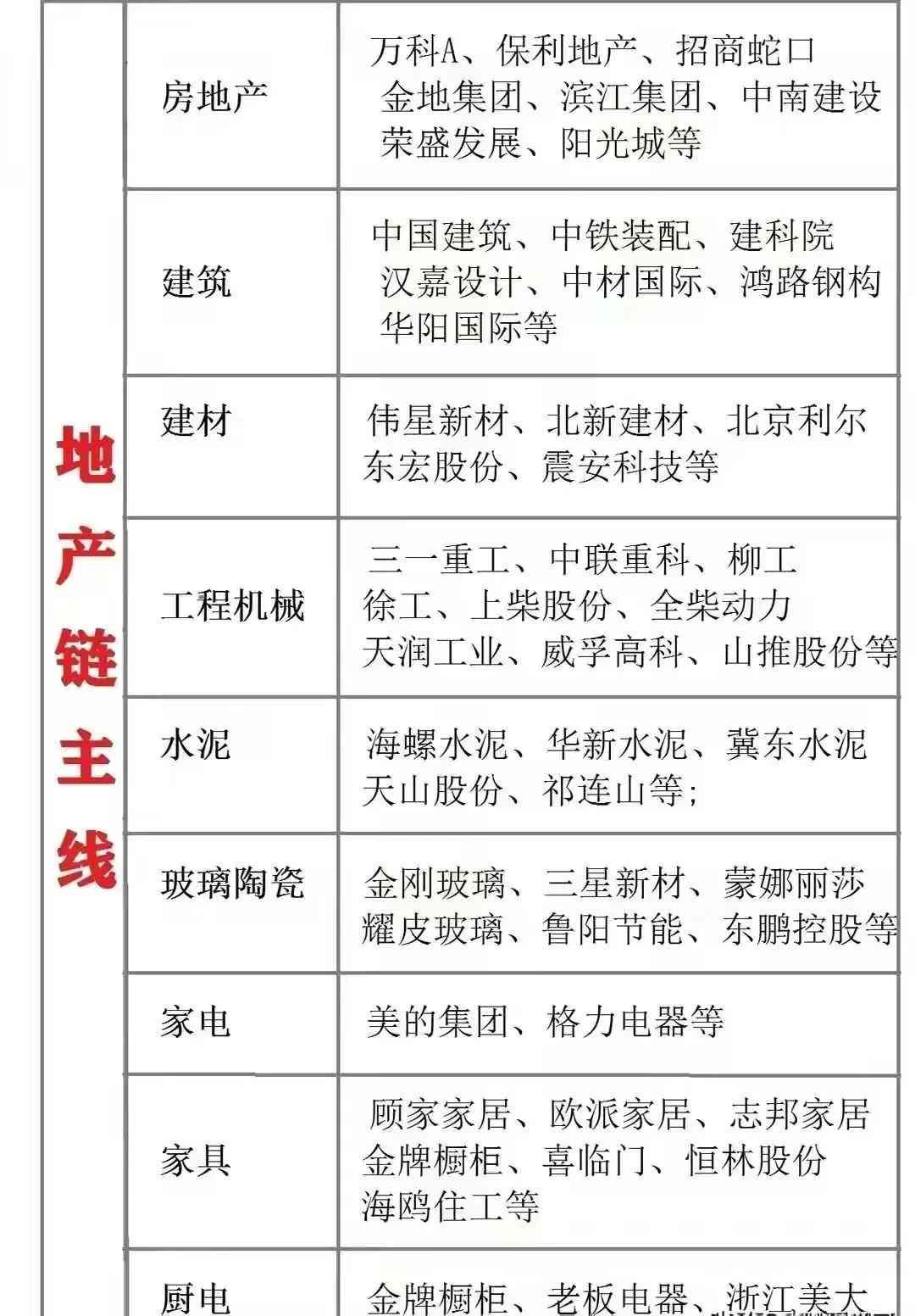 地产概念主线梳理:(1)房地产公司(2)建筑设计、(3)建材板块(4)工程机械(5)家具家电等等