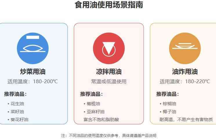 4.1 炒菜:推荐花生油、菜籽油、葵花籽油,耐高温且风味适中。