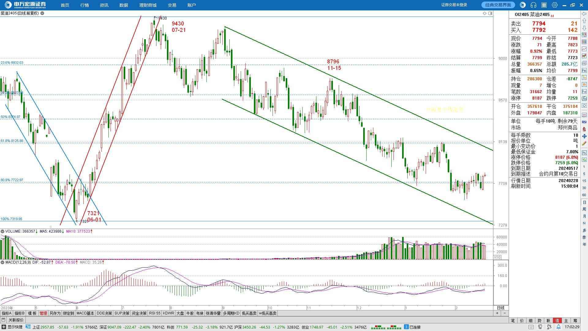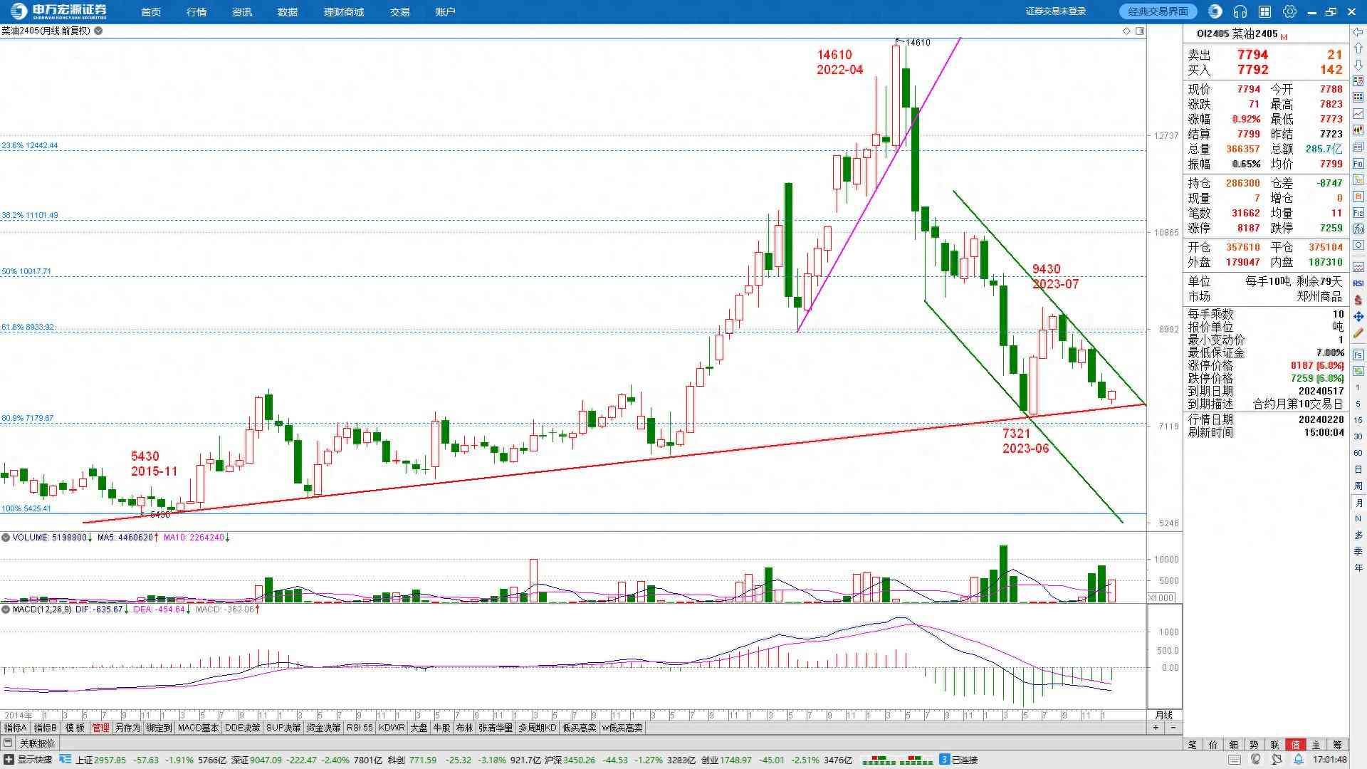 短线观点:沿菜油价格日线图上的绿色下跌通道看空。未来,价格突破这里的绿色上轨——短线下跌趋势线,则价格进入短线涨势。若这个涨势突破中级下跌趋势线,则这个短线涨势的起点也是中级涨势的起点。