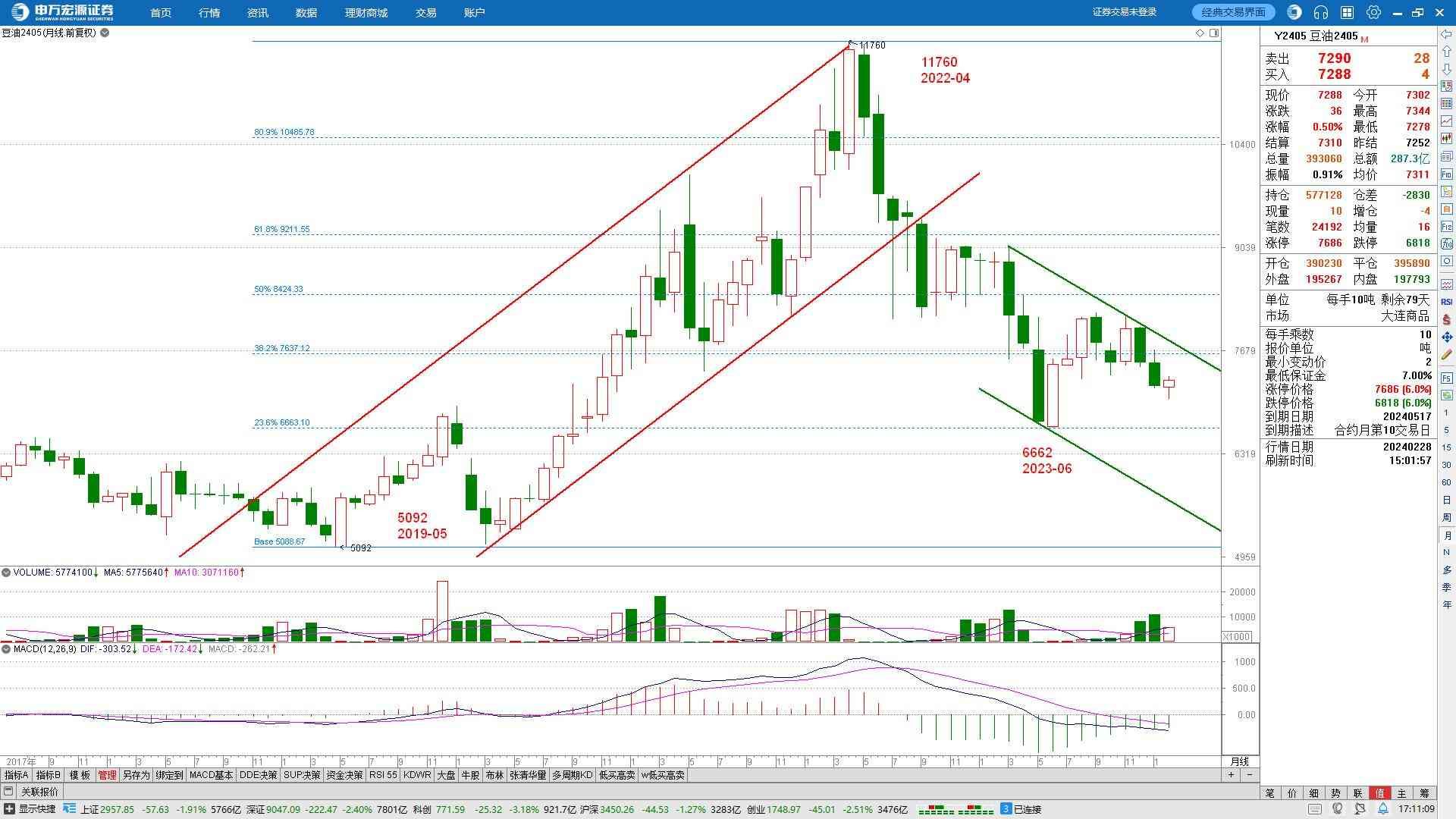 豆油见顶11760以来的熊市,也是走了先急跌、再缓跌的走势,图中的绿色下跌通道可以看作目前缓跌阶段的价格通道。