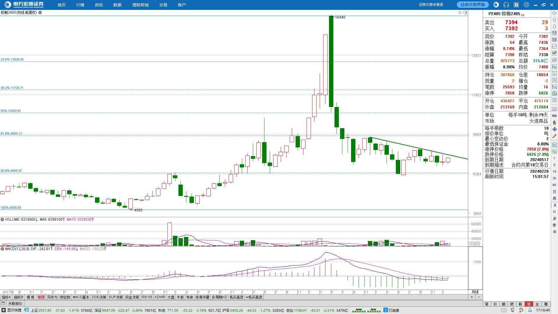 棕榈的走势与豆油的走势非常像,图中的绿色下跌趋势线就是目前中级熊市缓跌阶段的趋势线。