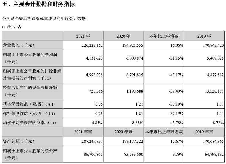 全年营收2262.25亿元,同比增长16.06%;归属于上市公司股东的净利润41.32亿元,同比下降31.15%;扣非净利润49.96亿元,同比下降43.17%;基本每股收益0.76元,同比减少37.19%。