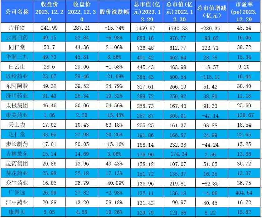2023年中药材涨价对中药企业有何影响。本文盘点2023年末A股市值排名前20的中药企业,包括片仔癀、云南白药、同仁堂、华润三九、白云山、以岭药业等,看看后疫情时代中药企业如何发展?