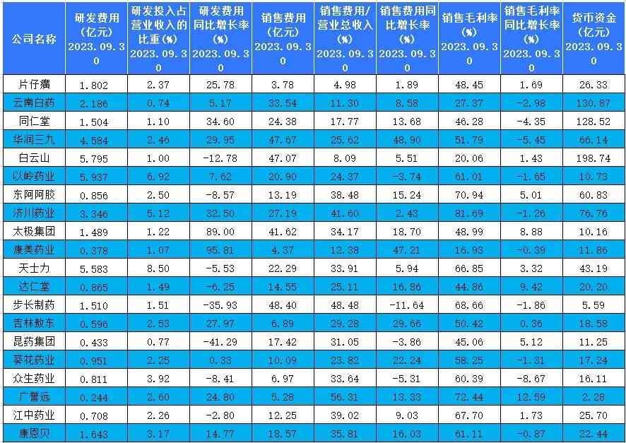 A股中药TOP20研发、销售费用、毛利率、货币资金情况