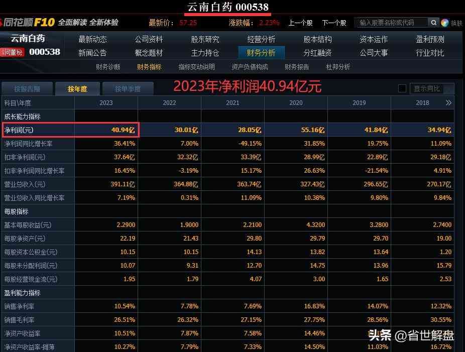 公司创立于1902年,是中华老字号中创新力突出的代表。专注于药品、健康品、中药资源和医药公司四大领域。其药品事业部主打云南白药系列,如气雾剂、膏药和创可贴等。荣誉包括:2017中国企业社会责任5优第55名、2018BrandZ最具价值中国品牌1强第28名(连续7年医疗领域第一)及2017年度最受投资者尊重的上市公司百强第5位等。2023年净利润高达40.94亿元,业绩同比增长36.41%,二线蓝筹,2023分红10派20.77元(含税),妥妥的现金奶牛,高股息的标杆。