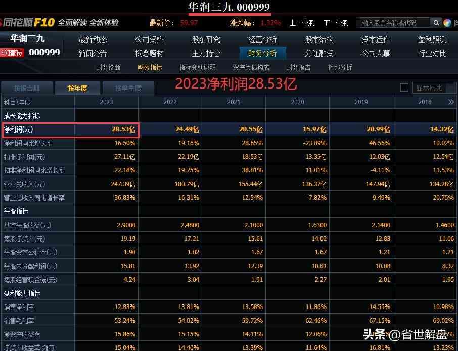 华润三九医药股份有限公司主要从事医药产品的研发、生产、销售及相关健康服务。主要产品包括999感冒灵、999皮炎平、参附注射液、注射用头孢、免煎中药、三九胃泰颗粒、正天丸等。“999”主品牌在消费者和医药行业中均享有较高的认可度,多次被评为“中国最高认知率商标”、“中国最有价值品牌”。2023年净利润28.53亿元,连续三年保持15%以上的高增长,分红10转3股派15元(含税),具备极好的成长性和盈利能力。