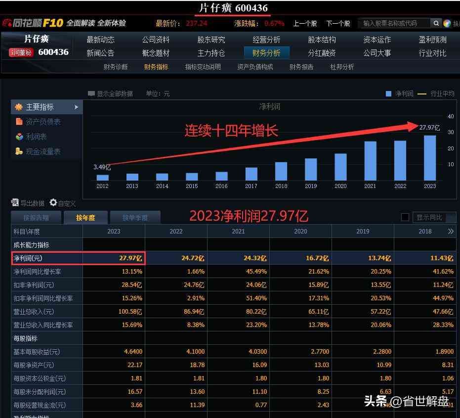 片仔癀凭借其悠久的历史、深厚的文化底蕴和显著疗效,形成独特品牌优势。作为“国宝名药”,源于宫廷、流传民间,26年获“中华老字号”称号,28年成为“国家级高新技术企业”,2011年其制作技艺被列入“国家级非物质文化遗产”。2021-2023年,片仔癀品牌连续居“胡润品牌榜医疗健康品牌价值榜”榜首,并荣获多项殊荣,如“最具历史文化底蕴品牌”“中药新媒体传播影响力药企十强”等,品牌价值高达409.37亿元。2023年净利润高达27.97亿元,业绩连续14年保持增长,权重股、一线蓝筹,今年分红10派23.20元(含税),具有极佳的成长性和分红能力。