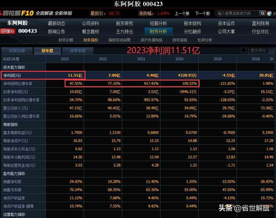 始建于1952年,1993年改制为股份制公司,1996年深交所上市,25年加入华润集团。2015年公司更名为“东阿阿胶股份有限公司”,现有员工37余人,总资产126亿元,品牌价值高达387.26亿元。公司专注于阿胶及系列产品的研发、生产和销售,是阿胶行业的领军者,也是滋补健康和中药企业高质量发展的典范。2023年净利润11.51亿元,连续四年保持在47%以上高增长,个股也是在走慢牛市之中。