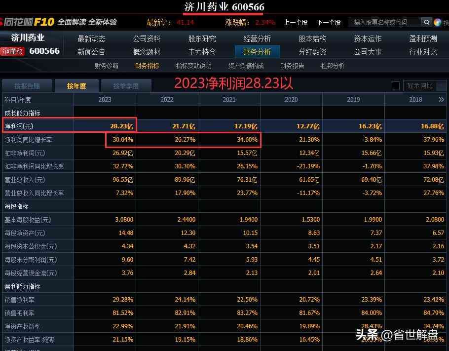 济川药业专注于儿科、消化、呼吸等领域的药品研发、生产和销售,主要产品包括蒲地蓝消炎口服液等。2023年,公司在中药行业品牌评选中荣获“2022中药上市公司TOP30”第11位及“2022中成药企业TOP1”第12位;在医药健康产业共生大会上,位列“中国中药企业TOP1”第7位。2023年净利润28.23亿,连续三年保持在30%左右的增速,绩优股的代表。