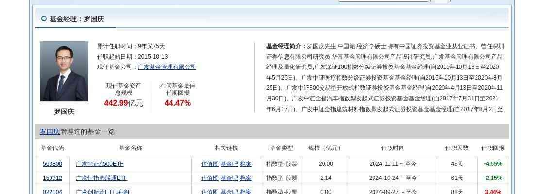 简历显示,罗国庆先生:中国籍,经济学硕士,持有中国证券投资基金业从业证书。曾任深圳证券信息有限公司研究员,华富基金管理有限公司产品设计研究员,广发基金管理有限公司产品经理及量化研究员,广发深证1指数分级证券投资基金基金经理(自2015年10月13日至2020年5月25日)、广发中证医疗指数分级证券投资基金基金经理(自2015年10月13日至2020年8月25日)、广发中证8交易型开放式指数证券投资基金基金经理(自2020年4月13日至2020年11月30日)、广发中证全指汽车指数型发起式证券投资基金基金经理(自2017年7月31日至2021年6月17日)、广发中证全指建筑材料指数型发起式证券投资基金基金经理(自2017年8月2日至2021年6月17日)、广发中证全指家用电器指数型发起式证券投资基金基金经理(自2017年9月13日至2021年6月17日)、广发中证1指数型发起式证券投资基金基金经理(自2018年11月2日至2021年6月17日)、广发深证1指数证券投资基金(LOF)基金经理(自2020年5月26日至2021年6月17日)、广发中证医疗指数证券投资基金(LOF)基金经理(自2020年8月26日至2023年2月22日)、广发中证沪港深科技龙头交易型开放式指数证券投资基金基金经理(自2021年5月20日至2023年7月25日)、广发中证沪港深科技龙头交易型开放式指数证券投资基金发起式联接基金基金经理(自2021年8月25日至2023年7月25日)、广发国证半导体芯片交易型开放式指数证券投资基金基金经理(自2020年1月20日至2023年12月13日)、广发中证1交易型开放式指数证券投资基金基金经理(自2019年5月27日至2024年3月30日)。现任广发基金管理有限公司指数投资部副总经理、广发中证传媒交易型开放式指数证券投资基金基金经理(自2017年12月27日起任职)、广发中证传媒交易型开放式指数证券投资基金发起式联接基金基金经理(自2018年1月2日起任职)、广发中证1交易型开放式指数证券投资基金发起式联接基金基金经理(自2019年5月27日至2024年10月27日)、广发中证创新药产业交易型开放式指数证券投资基金基金经理(自2020年12月3日起任职)、广发国证新能源车电池交易型开放式指数证券投资基金基金经理(自2021年6月15日起任职)、广发中证创新药产业交易型开放式指数证券投资基金发起式联接基金基金经理(自2021年7月7日起任职)、广发国证新能源车电池交易型开放式指数证券投资基金发起式联接基金基金经理(自2021年8月16日起任职)、广发中证1交易型开放式指数证券投资基金基金经理(自2022年7月28日起任职)、广发中证国新央企股东回报交易型开放式指数证券投资基金基金经理(自2023年5月24日起任职)、广发上证科创板成长交易型开放式指数证券投资基金基金经理(自2023年8月23日起任职)、广发中证港股通非银行金融主题交易型开放式指数证券投资基金基金经理(自2023年11月10日起任职)、广发上证科创板成长交易型开放式指数证券投资基金发起式联接基金基金经理(自2023年11月16日起任职)、广发中证国新央企股东回报交易型开放式指数证券投资基金发起式联接基金基金经理(自2023年11月24日起任职)、广发中证1交易型开放式指数证券投资基金联接基金(自2024年8月8日起任职)。自2021年8月9日至2024年8月8日任广发国证半导体芯片交易型开放式指数证券投资基金联接基金基金经理。现任广发中证A5交易型开放式指数证券投资基金基金经理。