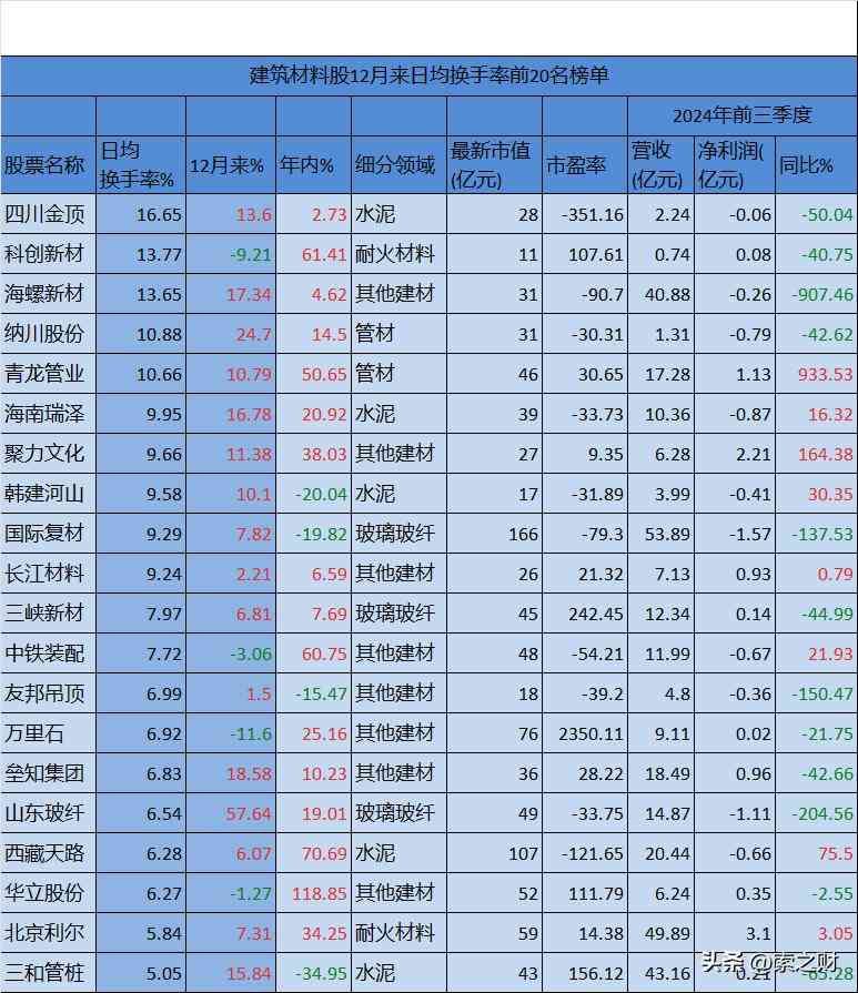 日均换手率作为衡量股票市场活跃度的重要指标,能够直观反映资金追逐的热点。我从A股建筑材料股中,筛选出20家12月来日均换手率(截止12月9日,下同)较高的个股,供大家参考。