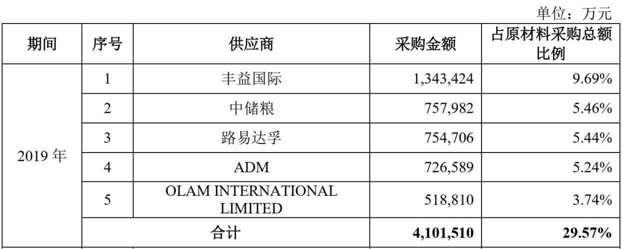 从供应商来看,2019年金龙鱼的前五大供应商如下: