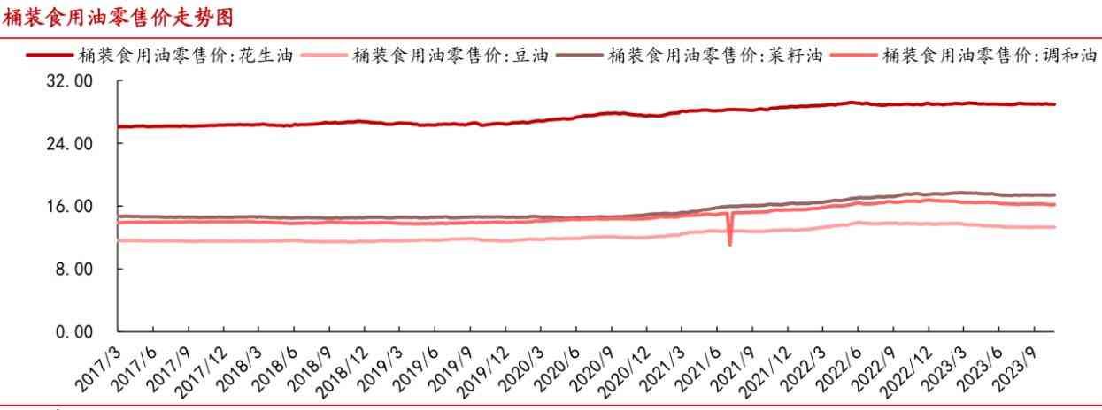事实上,鲁花集团主打的高端花生油也的确是门好生意。据了解,食用植物油按照油种分为大豆油、玉米油、菜籽油、葵花籽有、橄榄油等,而这几年橄榄油等中高端油种结构占比持续提升。据万得数据显示,2022年,大豆油、玉米油、菜籽油、葵花籽油、橄榄油、其他食用油的销售额占比分别为34.02%、11.68%、11.14%、7.86%、4.45%和30.85%,较2017年分别变化-3.24%、0.13%、1.22%、-0.06%、0.31%和1.63%,大豆油占比下降明显。此外,花生油的零售价也明显高于其他大部分食用油。