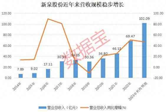 新泉股份营收规模近年来稳步增长,2022年营收规模近70亿元,2023年机构预测将超1亿元。业绩方面,以预告净利润中值计算,2023年净利润同比增幅超70%。由此可见,2023年营收净利将创历史纪录。