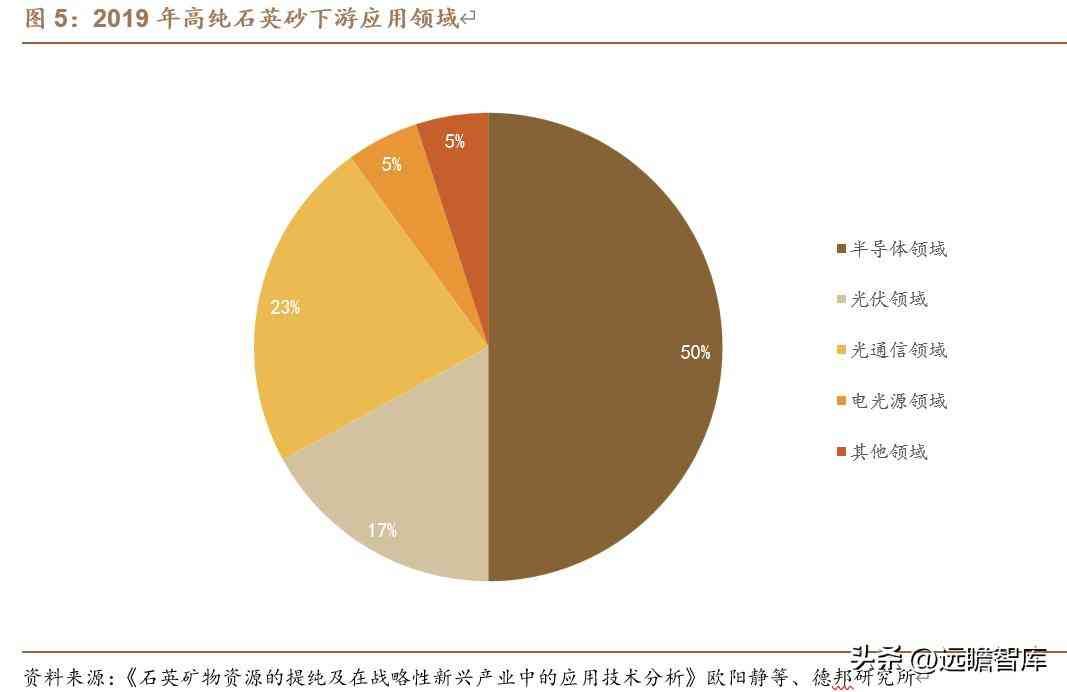 高纯石英下游应用领域广泛,对石英砂纯度要求较高。高纯度石英砂产品从中低端到高端一般应用路径为光源行业(99.5%-99.99%)、高端光学器件、激光器件(99.99%以上)、到光纤通信、半导体、光伏、微电子等领域(99.995-99.999 9%)。