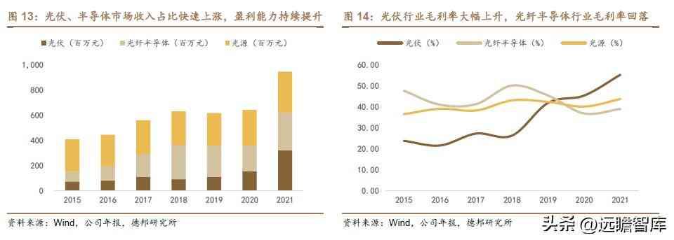 光伏、半导体市场占比快速上涨,盈利能力持续提升。2021年,光源类传统产品的营业收入占比从高点的70%以上下降至34.4%,光伏、半导体类营收占比提升至65%,同比提升9.61pp。其中,光源行业仍是营业收入占比最多的行业,其产品收入平稳,主营收入较上年同期增加4,306万元,同比增长15.3%;半导体产品的收入占公司主营业务收入的31.9%,主营收入较上年同期增加9,531万元,同比增长46.4%;光伏行业近几年的增速最快,其主营收入占公司主营业务收入的33.8%,较上年同期增加16,579万元,同比增长108.5%。