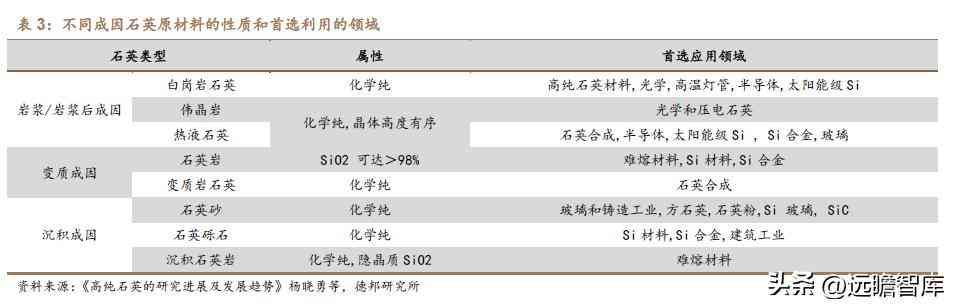 石英特性稳定,高纯石英广泛应用于高新技术产业。石英是由硅原子和氧原子组成的硅氧四面体在三维空间中有序排布形成的氧化物矿物。石英在自然界中广泛存在于岩浆岩、沉积岩、变质岩和热液脉体中,其中岩浆岩中的石英总量占岩石圈总量的93.6%。石英的稳定特性使其成为工业主要用料,但随着科技发展,传统的天然石英已不能满足半导体、精密光学、光伏等高新技术产业的生产需求。高纯石英通过对天然纯净石英提纯加工得到,广泛应用于高新技术产业,同时也是绿色环保战略资源,具有较高附加值。