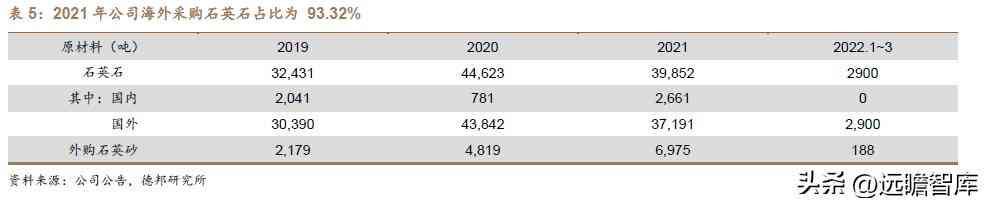 公司2021年高纯石英砂销量为2.36万吨,其中外销1.41吨,自用0.95吨。此外公司有稳定的矿源供应。年报披露,2022年,公司将进一步加快半导体产品的产能扩张,争取完成6吨/年半导体石英制品项目达产、2吨/年高纯石英砂项目达产及15吨/年高纯石英砂项目建设工作。