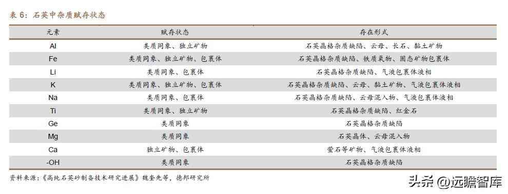 目前花岗岩石英和脉石英为生产高纯石英砂主要原料,其中花岗岩石英矿床规模大,石英纯度高,但石英含量较低,花岗伟晶岩的矿物成为主要为微斜条纹长石、钠长石、石英、白云母、以及少量的石榴子石;而脉石英矿床则分布广泛,但规模相对较小。