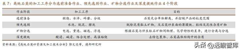 根据《高纯石英砂资源及加工技术分析》一文 ,工序是指除去石英原矿中伴生脉石、包裹体杂质及晶体结构杂质的作业过程,通常包括煅烧、水淬、磨矿、分级、水洗脱泥、擦洗、电选、磁选、浮选、酸浸、碱浸、高温焙烧等工序。根据加工目的不同将其分为选前准备作业、预先选别作业、矿物分选作业及深度提纯作业4个阶段。