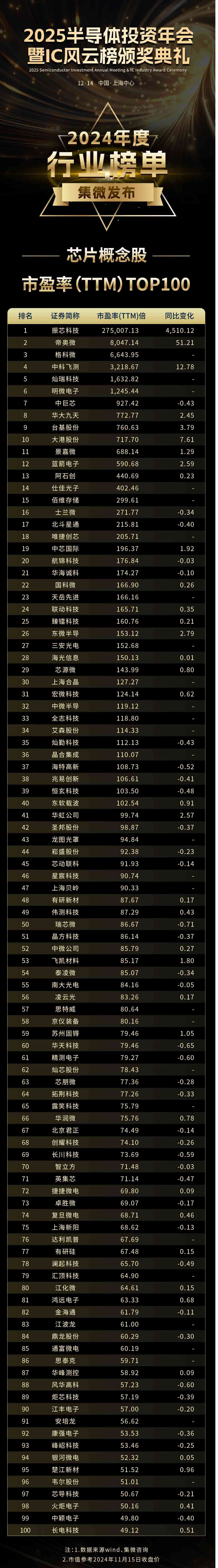 中国芯“芯片概念股”市盈率(TTM)TOP100:振芯科技275007第一