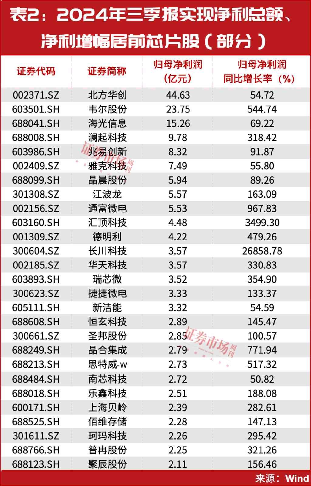 目前,披露2024年全年业绩预告的公司只是“冰山一角”。从2024年三季报的完整数据来看,芯片公司的业绩结构改善较为明显。统计161只标的股,有86只实现增长。进一步来看,业绩增幅超过50%且实现净利润超过2亿元的公司有接近30家,如北方华创、韦尔股份、海光信息、澜起科技等(见表2)。