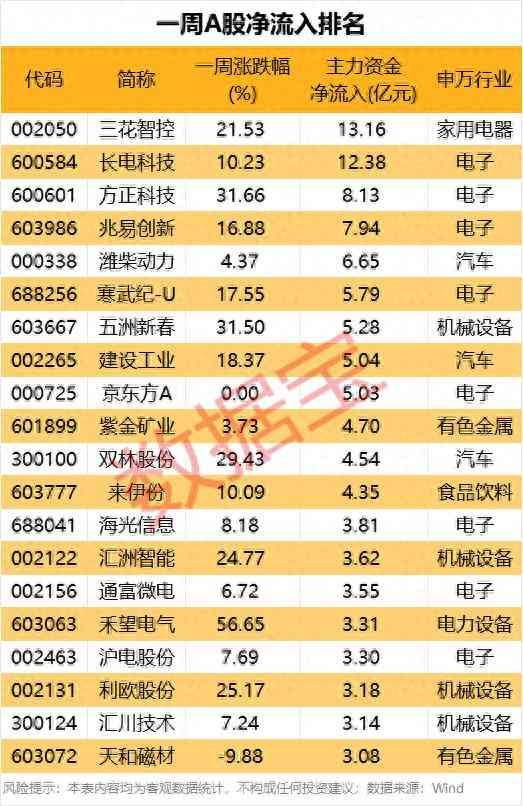 个股方面,除去新股,本周78股主力资金净流入1亿元以上。三花智控、长电科技净流入额逾10亿元,分别为13.16亿元、12.38亿元;方正科技、兆易创新、潍柴动力、寒武纪-U、五洲新春、建设工业、京东方A等股紧随其后,净流入额均在5亿元以上。