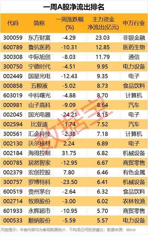 净流出方面,本周24股主力资金净流出在5亿元以上。东方财富、鲁抗医药、中际旭创净流出额前三,金额依次为23.03亿元、12.85亿元、11.79亿元。