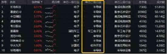 今日(1月10日)芯片股持续走强,截至发稿,电子50指数涨幅前10大成份股中,半导体行业个股占据8席,其中长电科技盘中触板,现涨超8%,寒武纪-U涨超4%,中芯国际、通富微电涨逾3%。